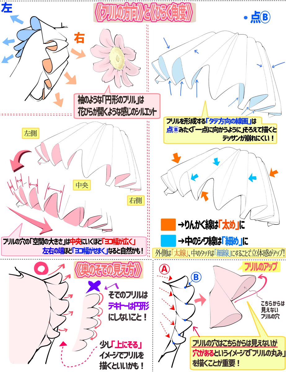 Web 作業時間150分 レベル★★★☆☆ 春夏になると着たくなるフリルの服、着ると気持ちがウキウキしてきますよね。 今回は、大人可愛く着れる、フリル袖チュニックの作りWebこの作品 「フリルの描きかた」 は 「講座」「フリル」 等のタグがつけられた「key」さんの漫画です。 「 結構前のアンケートで多かったフリル講座作ってみました。基本・応用・おま